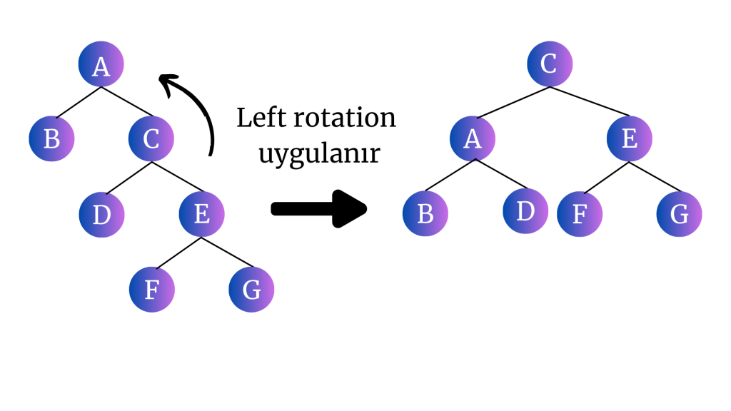 Aşağıdaki ağaçta A node’unda dengesizlik meydana gelmektedir. A node’unun sağında bulunan C node’u sola döndürülerek A node’unun yerini alır. A node’u, C node’unun left’i haline gelir. C’nin döndürülmeden önceki left’i olan D node’u ise A node’unun right’ı olur.