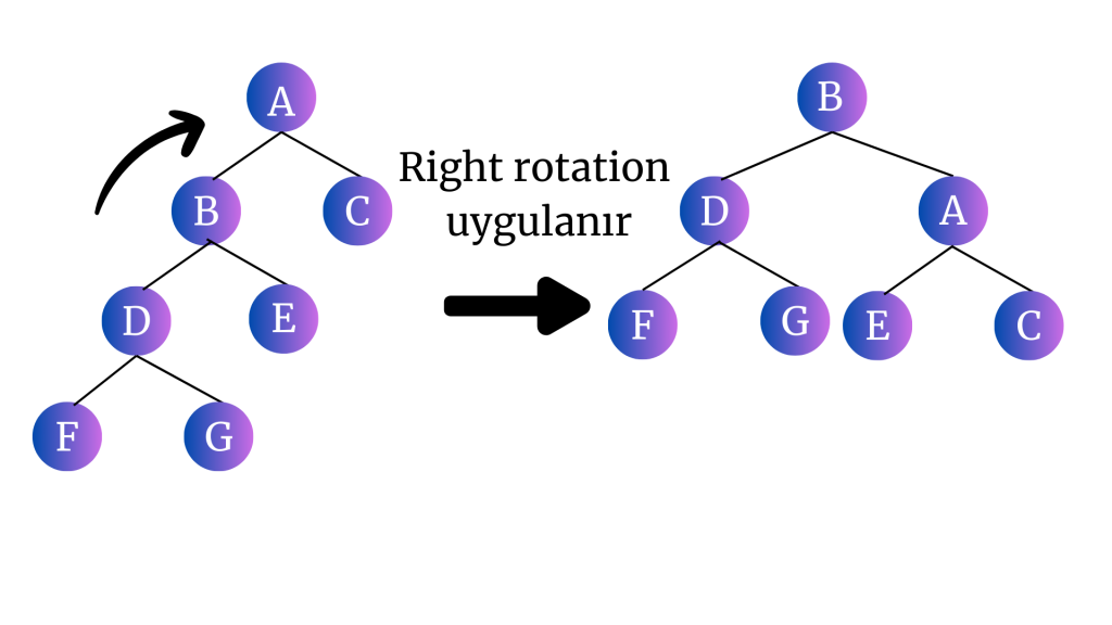 Aşağıdaki ağaçta A node’unda dengesizlik meydana gelmektedir. A node’unun solunda bulunan B node’u sağa döndürülerek A node’unun yerini alır. A node’u, B node’unun right’ı haline gelir. B’nin döndürülmeden önceki right’ı olan E node’u ise A node’unun left’i olur.