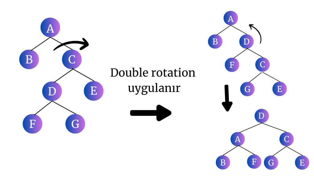 Aşağıdaki ağaçta A node’unda dengesizlik meydana gelmektedir. Öncelikle C node’u sağa döndürülerek D node’unun rigt’ı haline gelir. D node’u ise A node’unun right’ı olur. Dengesizlik hala devam ettiği için tekrar bir döndürme işlemi uygulanır. D node’u döndürülerek A node’unun yerini alır. A node’u D node’unun rigt’ı haline gelir. A node’unun right’ı ise F node’u olur.