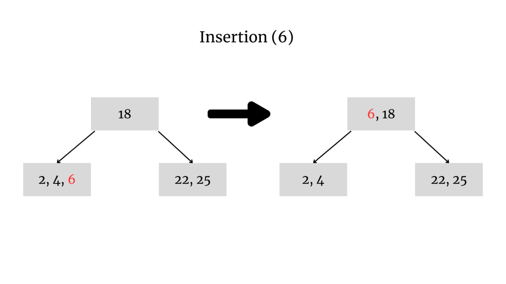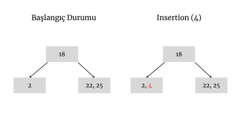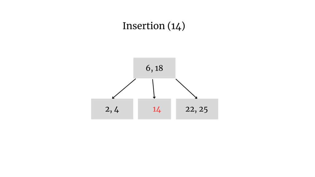 Eleman her zaman ağacın yaprağına eklenir. Eklendiğinde eğer node, maksimum değerinden fazla key olursa ortadaki key yukarı taşınır ve node’lar düzenlenir. Aşağıdaki 2-3 ağacına sırasıyla 4, 6 ve 14 key’leri eklenmiştir.