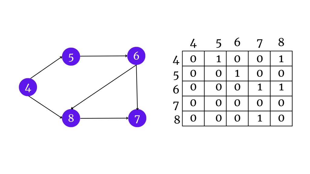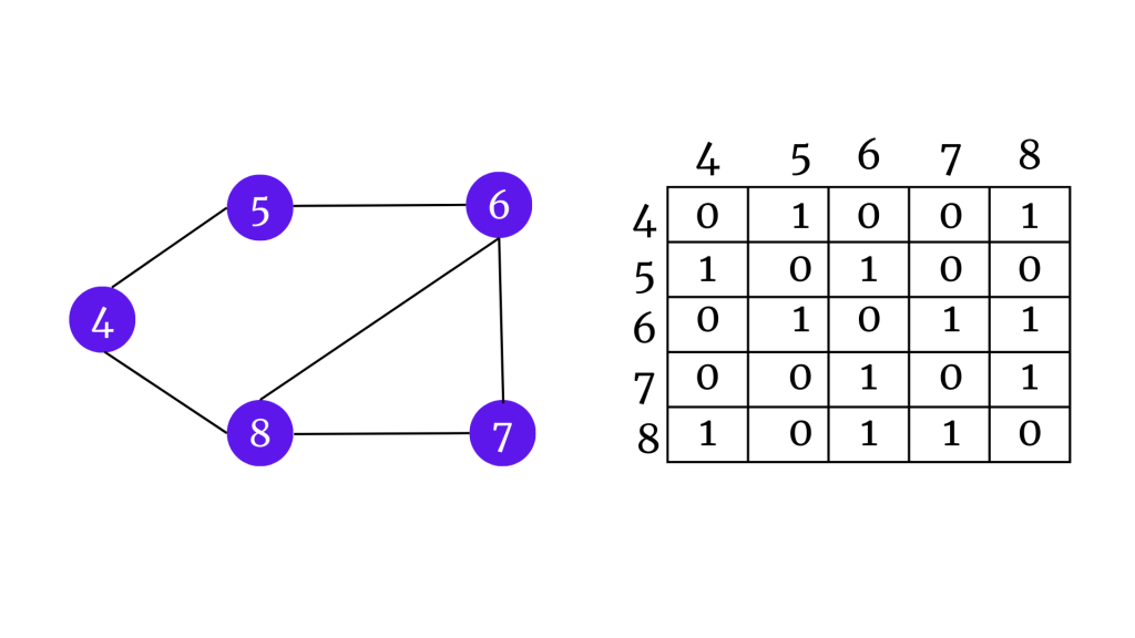 Komşusu olan vertex’e 1, olmayan vertex’e 0 yazarak bir graph’ın komşularını komşuluk matrisi ile gösterebiliriz.