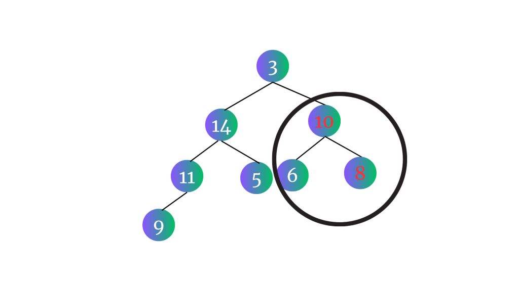 11 node’u için, tek çocuğu olan 9’dan büyük. İşlem yapmamıza gerek yok. 14 node’u yine iki çocuğu 11 ve 5’ten büyük işlem yapmamıza gerek yok. 8 node’unda ise sol çocuğu olan 10 daha büyük. Burada ikisinin yerini değiştirmemeniz yani swap gerçekleştirmeliyiz.