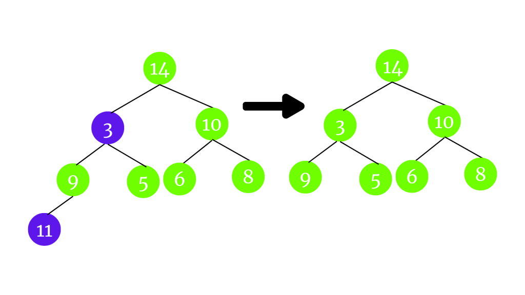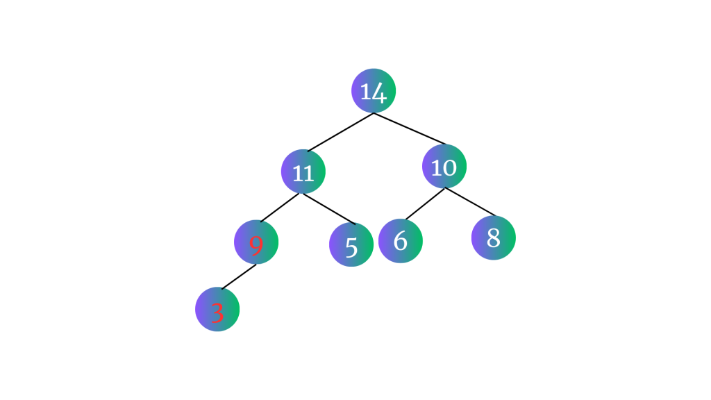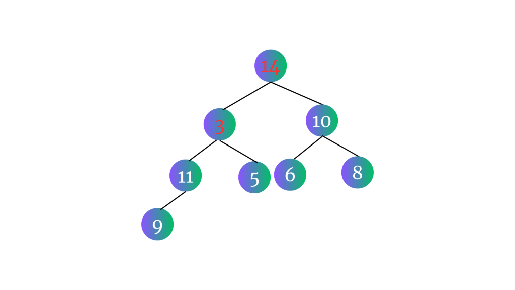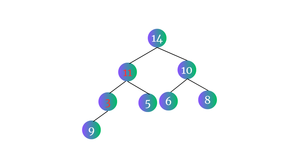 3 node’unu yer 11 ile yer değiştirdik fakat bu sefer de yeni çocuğu olan 9 dan küçük. 3 ve 9 için swap işlemini uygulayalım.