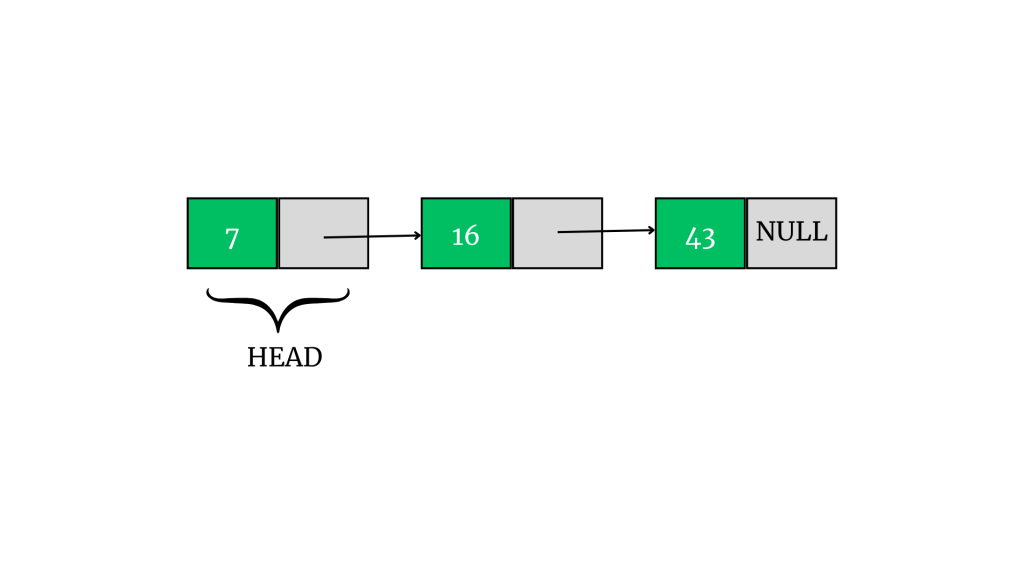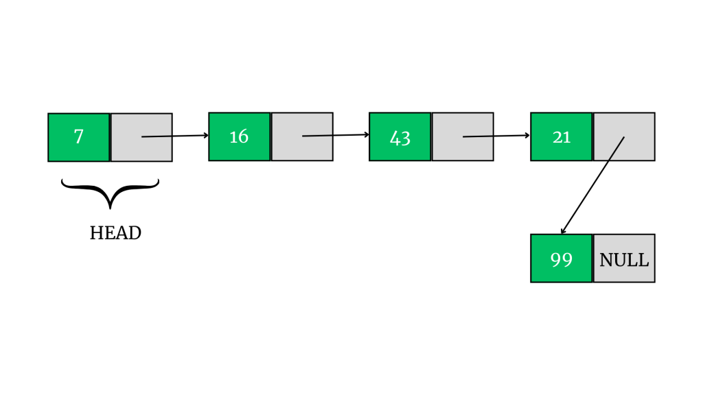 Aşağıdaki gibi bir singly linked listimiz olsun. Sırasıyla bu linked list’in başına 7, sonuna 99 ve “43” değerini barındıran node’un ilerisine 21 değerini içeren yeni node’lar ekleyelim.