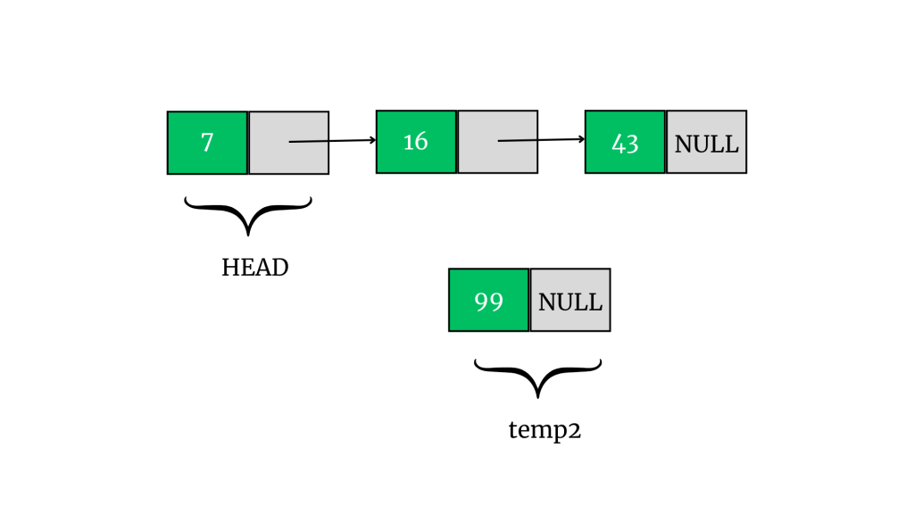 Malloc fonksiyonu kullanarak yukarıda oluşturduğumuz gibi bu sefer temp2 isminde olan yeni bir node tanımlayalım. Bu node’un data değerine 99, next değerine ise; node, linked list’in son elemanı olacağından NULL değerini atayalım. Ve aşağıdaki görüntü elde etmiş oluyoruz.