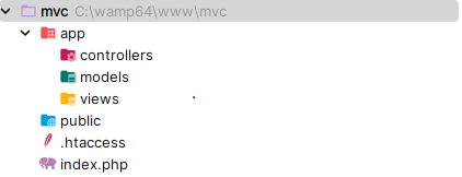 index.php routing işleminin gerçekleştiği yer, .htaccess sunucu yapılandırmalarının gerçekleştiği dosya, app/models Model dosyalarını içeren kısım, app/views view dosyalarını içeren kısım ve app/controllers controller dosyalarını içeren kısım olacak. Bu proje dizini ihtiyaca göre farklı bir şekilde de yapılandırılabilir. Bizim yapacağımız proje basit olacağından dolayı şimdilik daha fazla öğeye ihtiyacımız yok.